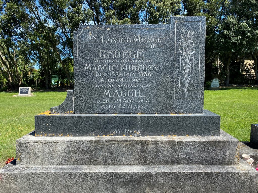 ‘In loving memory of George beloved husband of Maggie Kiihfuss died 15th July 1936 aged 58 years. Also his beloved wife Maggie died 6th Aug 1963 aged 82 years. At rest.’