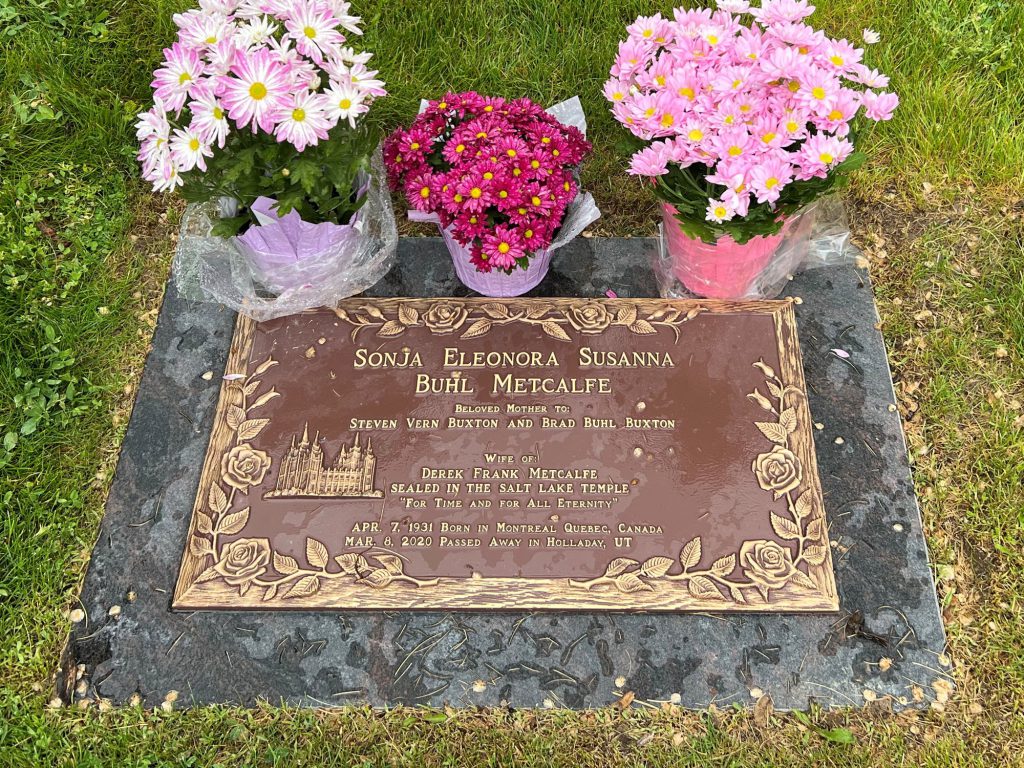 ‘Sonja Eleonora Susanna Buhl Metcalfe beloved mother to Steven Vern Buxton and Brad Buhl Buxton; Wife of: Derek Frank Metcalfe; Sealed in the Salt Lake Temple “For Time and For All Eternity”; Apr. 7, 1931 born in Montreal Quebec, Canada; Mar. 8, 2020 passed away in Holladay, UT’