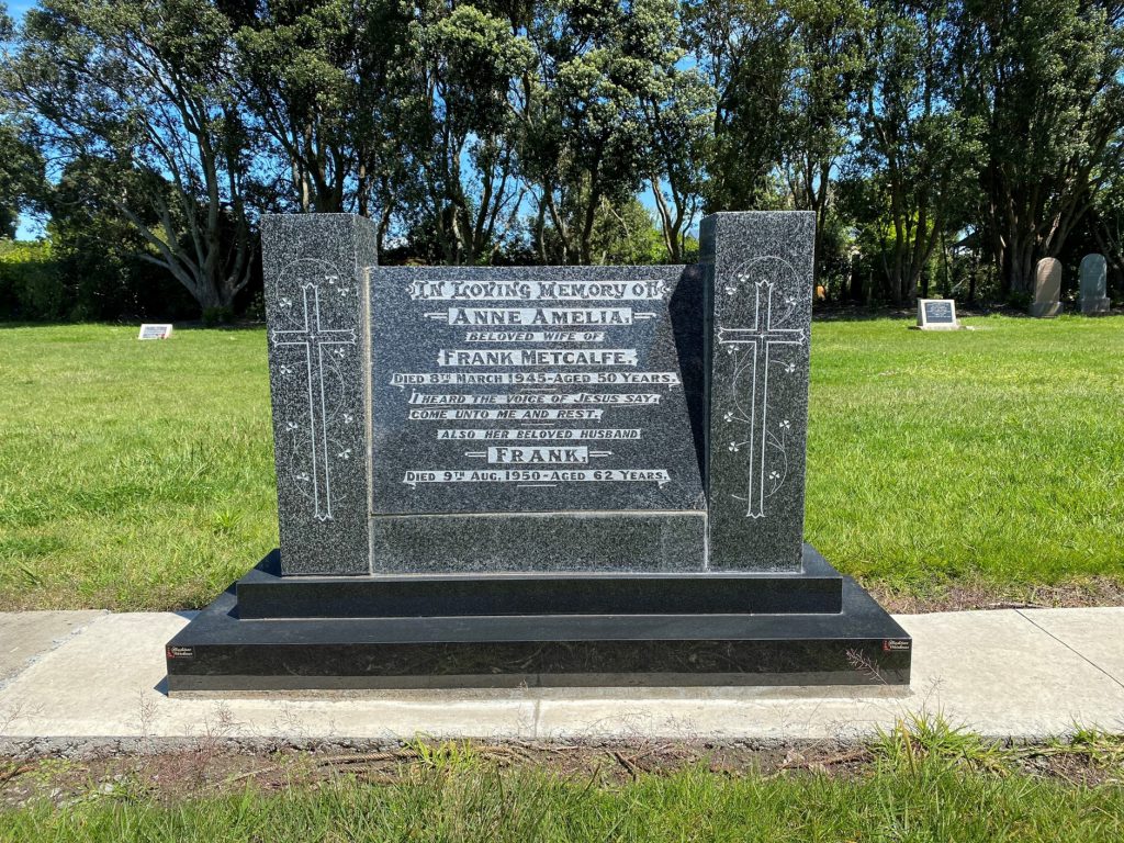βIn loving memory of Anne Amelia, beloved wife of Frank Metcalfe, died 8th March 1945 β aged 50 years. I heard the voice of Jesus say, Come unto me and rest. Also her beloved husband Frank, died 9th Aug 1950 β aged 62 years.β